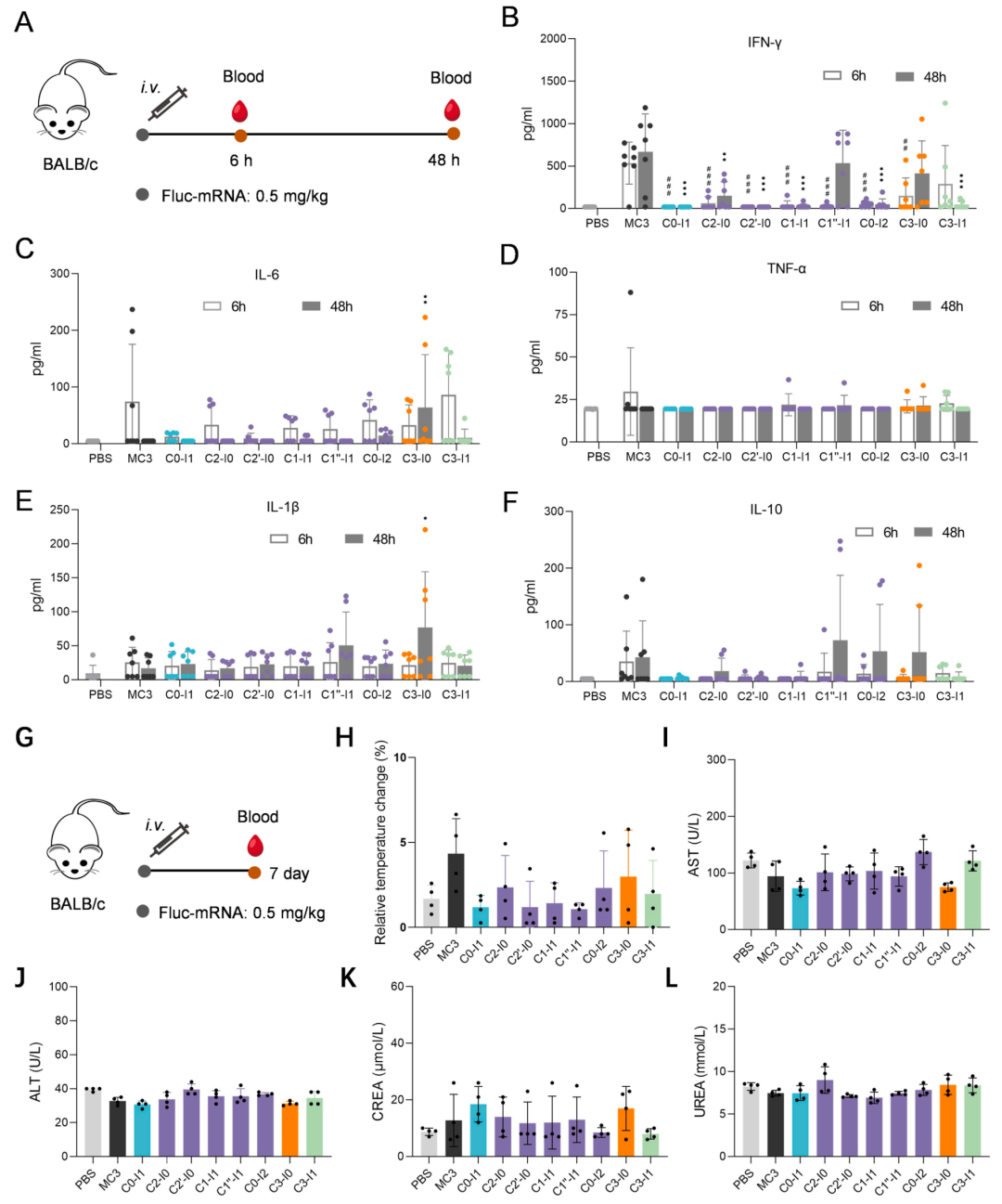 静脉注射Fluc-mRNA负载的LNPs后,血清细胞因子检测显示,不同LNPs诱导的免疫反应存在差异。C0-I1、C2-I0、C2'-I0、C1-I1和C0-I2在6-48小时内诱导的IFN-γ水平低于MC3基LNP,而C1''-I1、C3-I0和C3-I1在24-48小时内诱导的IFN-γ水平较高(图6B)。IL-6水平在6小时时普遍升高,但C0-I1和C2'-I0除外,且所有LNPs在48小时内均恢复至正常水平(图6C)。IL-10水平在24-48小时内由C1''-I1和C3-I0显著诱导(图6F)。TNF-α和IL-1β水平在各LNPs间无显著差异(图6D, E)。RAW 264.7细胞实验进一步证实,不同LNPs诱导的IL-6分泌水平与其尾部不饱和度相关,其中C0-I1和C2'-I0的IL-6分泌量显著低于MC3基LNP。