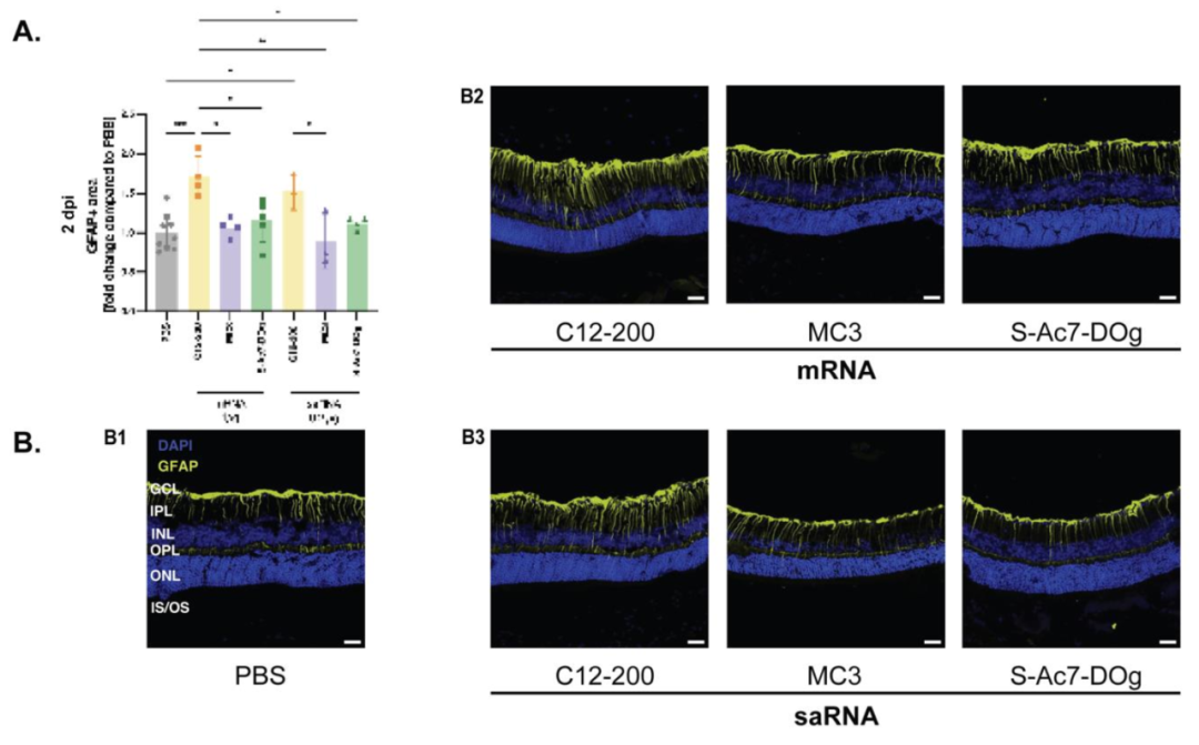 Figure 6: Müller glia and astrocyte reactivity in the retina associated with the intravitreal delivery of mRNA and saRNA LNPs in mice