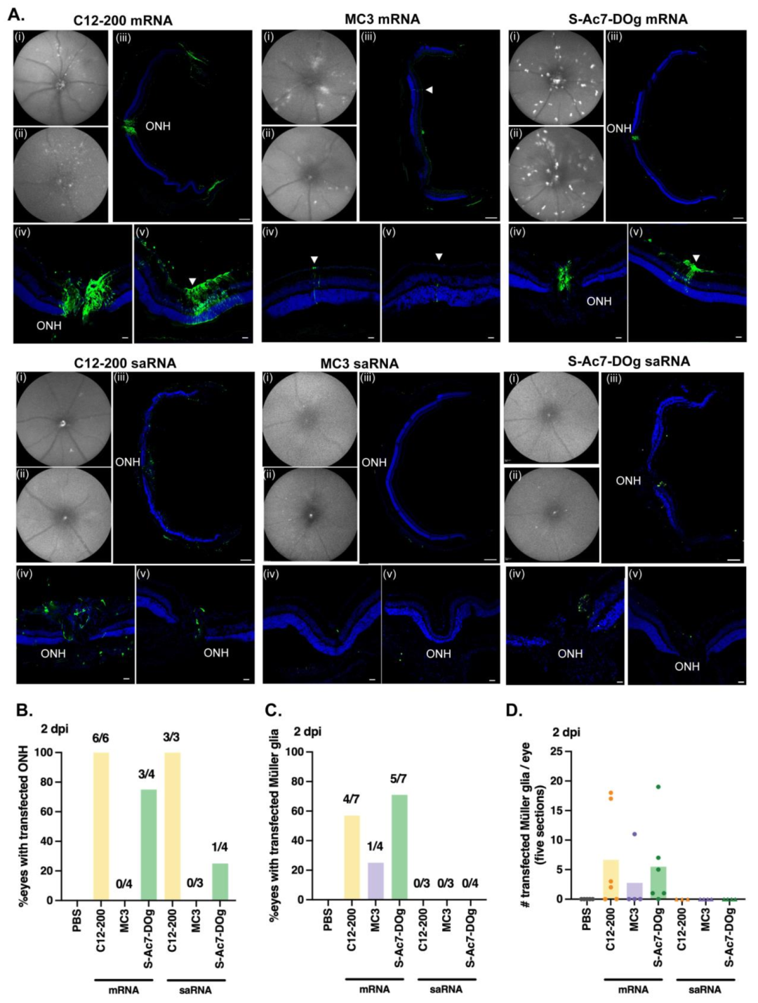 视网膜eGFP表达:mRNA和saRNA LNPs在视网膜中的表达主要限于视神经头(ONH)区域和少数Müller胶质细胞(图2)。注射后2天,C12-200和S-Ac7-DOg mRNA LNPs在100%的眼中检测到eGFP表达,而MC3 mRNA LNPs在88%的眼中检测到表达(图2A)。saRNA LNPs的表达率较低,C12-200 saRNA LNPs在83%的眼中检测到表达,MC3和S-Ac7-DOg saRNA LNPs的表达率更低。注射后7天,所有mRNA LNPs均保持较高的eGFP表达率,而saRNA LNPs的表达率有所下降。尽管C12-200和S-Ac7-DOg LNPs在表达率上表现较好,但整体eGFP表达量仍然有限,每个视网膜切片的平均转染Müller胶质细胞数少于20个(图2B-D)。