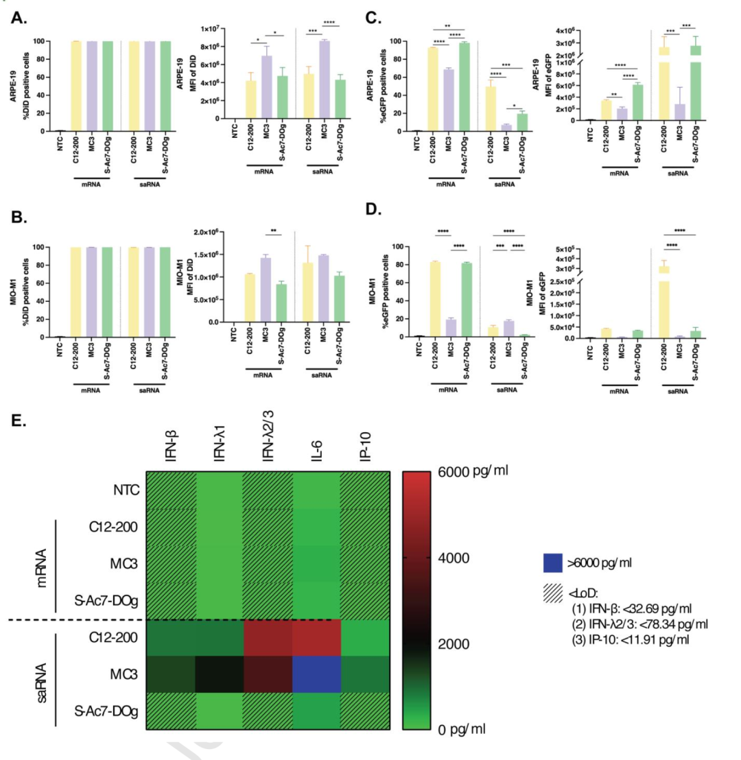 Figure 1: Cellular uptake, transfection efficiency, and innate immune-stimulating activity of mRNAand saRNA-loaded LNPs in ARPE-19 and MIO-M1 cells.