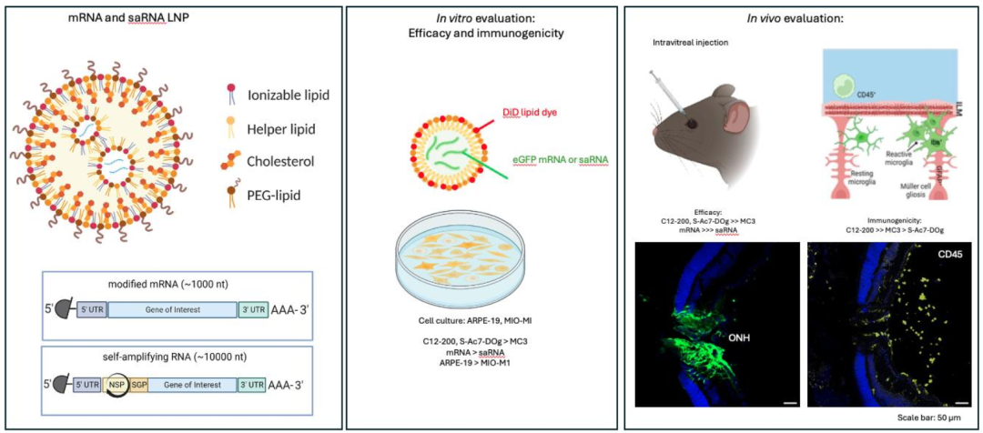 参考文献:Li, Weiran, et al. "Efficacy versus immunogenicity of LNP-mediated delivery of mRNA and self-amplifying RNA upon intravitreal injection in the mouse eye." Journal of Controlled Release (2025): 114027.