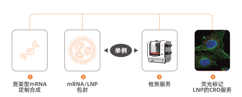 | mRNA合成 | LNP合成 | 理化检测 | 细胞评价 | 动物评价 |