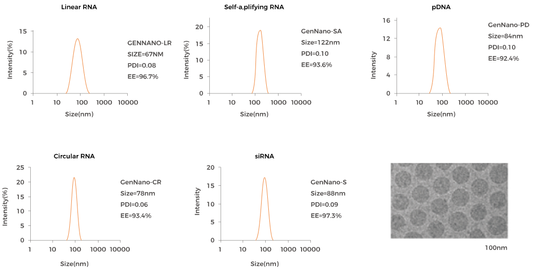 支持mRNA/siRNA/Cas mRNA & sgRNA/DNA/蛋白包封 |